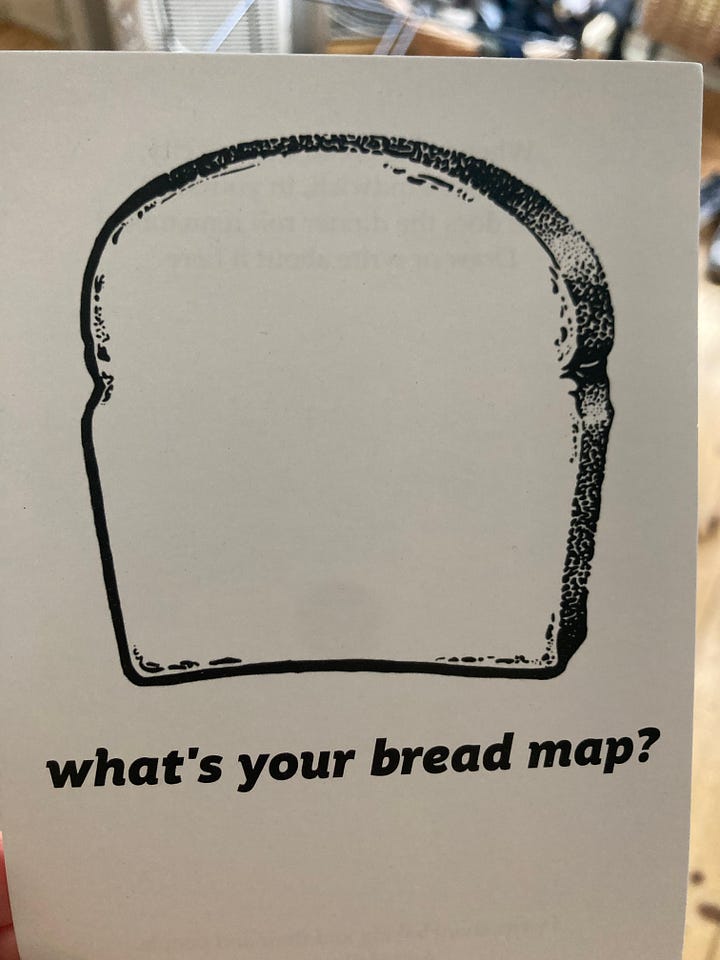 Even more than the fun of finding these places and getting a sense of them in my head, is planting the idea of bread maps in other people’s heads. I made a postcard with an iconic piece of bread, popped them in a toaster2 and hoped people would take them to muse about the place of bread in their lives.